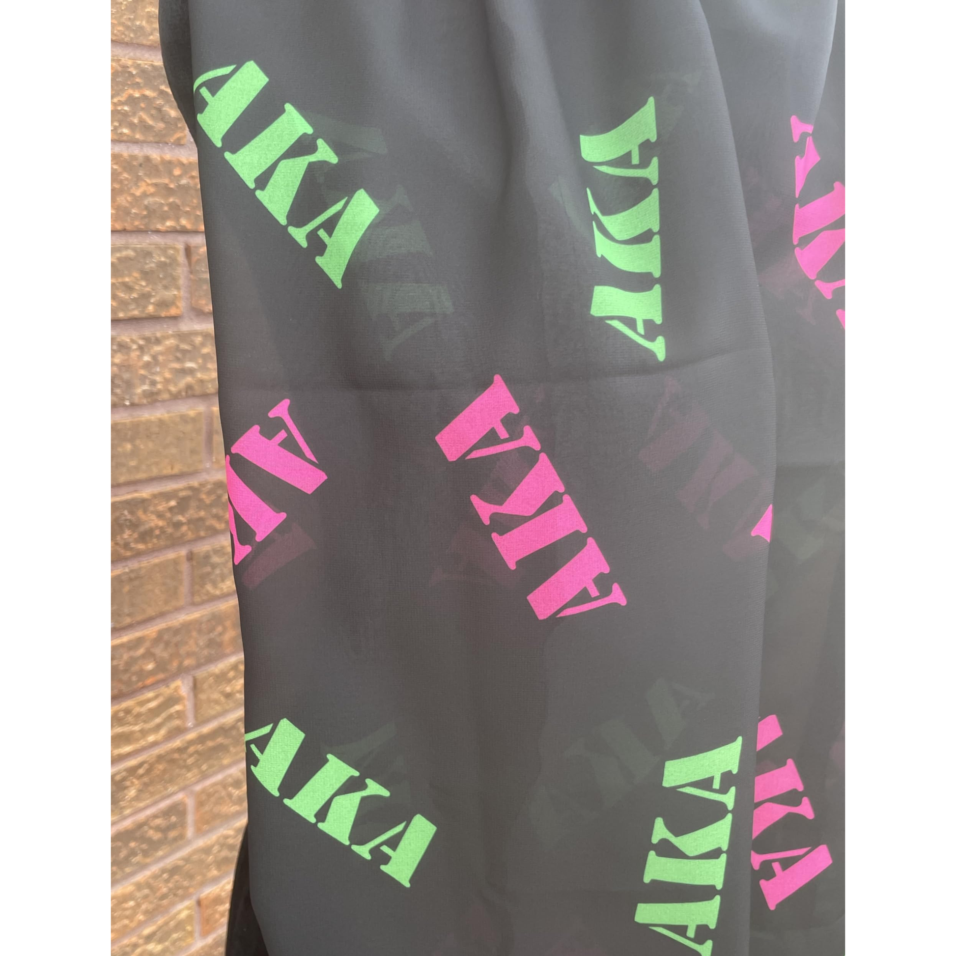 This pink and green AKA paraphernalia scarf functions as the perfect gift. It is expertly crafted from high-quality chiffon fabric and makes a great accessory for any outfit. Its lightweight and airy texture makes it perfect for any season, while its delicate drape adds an elegant touch. Add a touch of sophistication to your wardrobe with this versatile chiffon scarf.