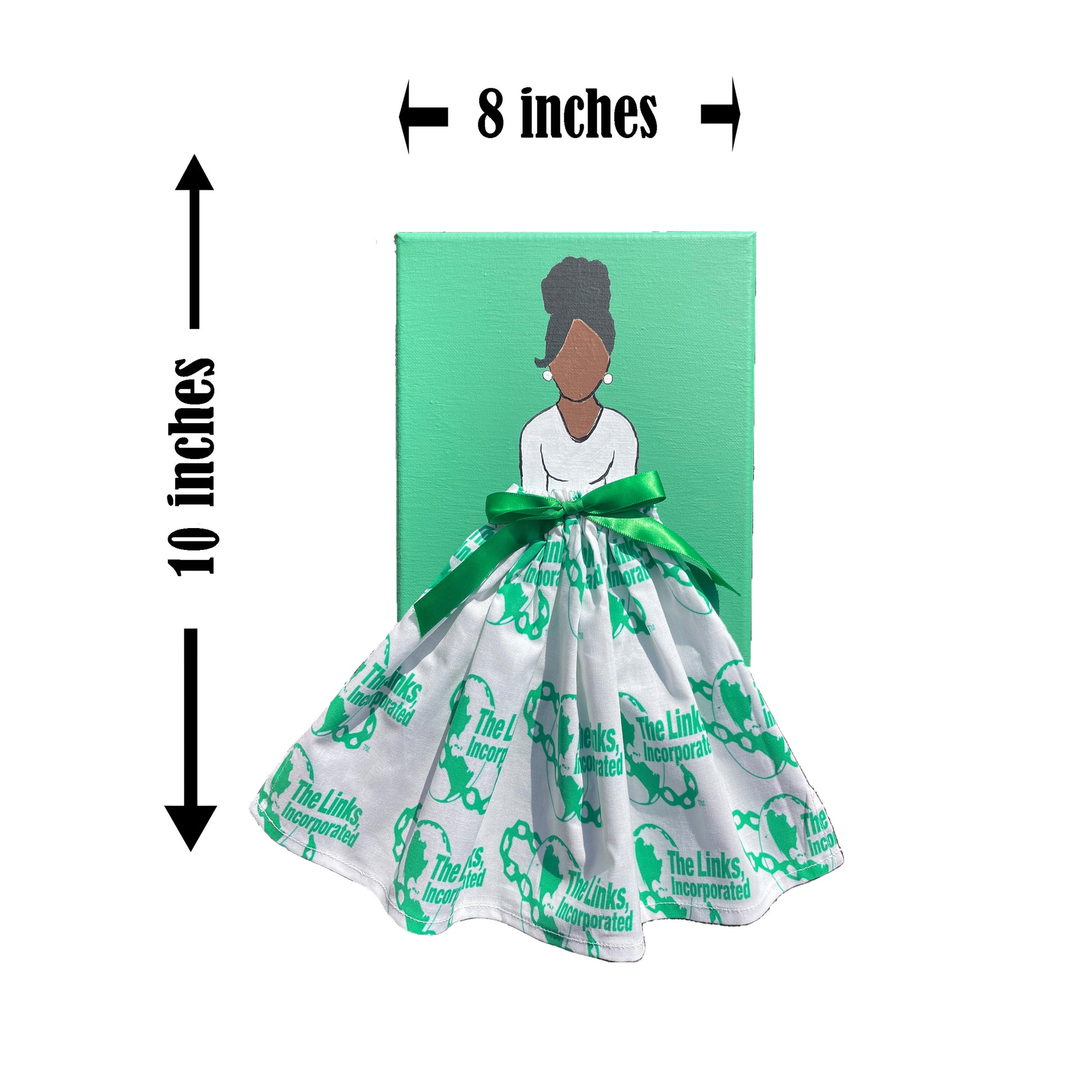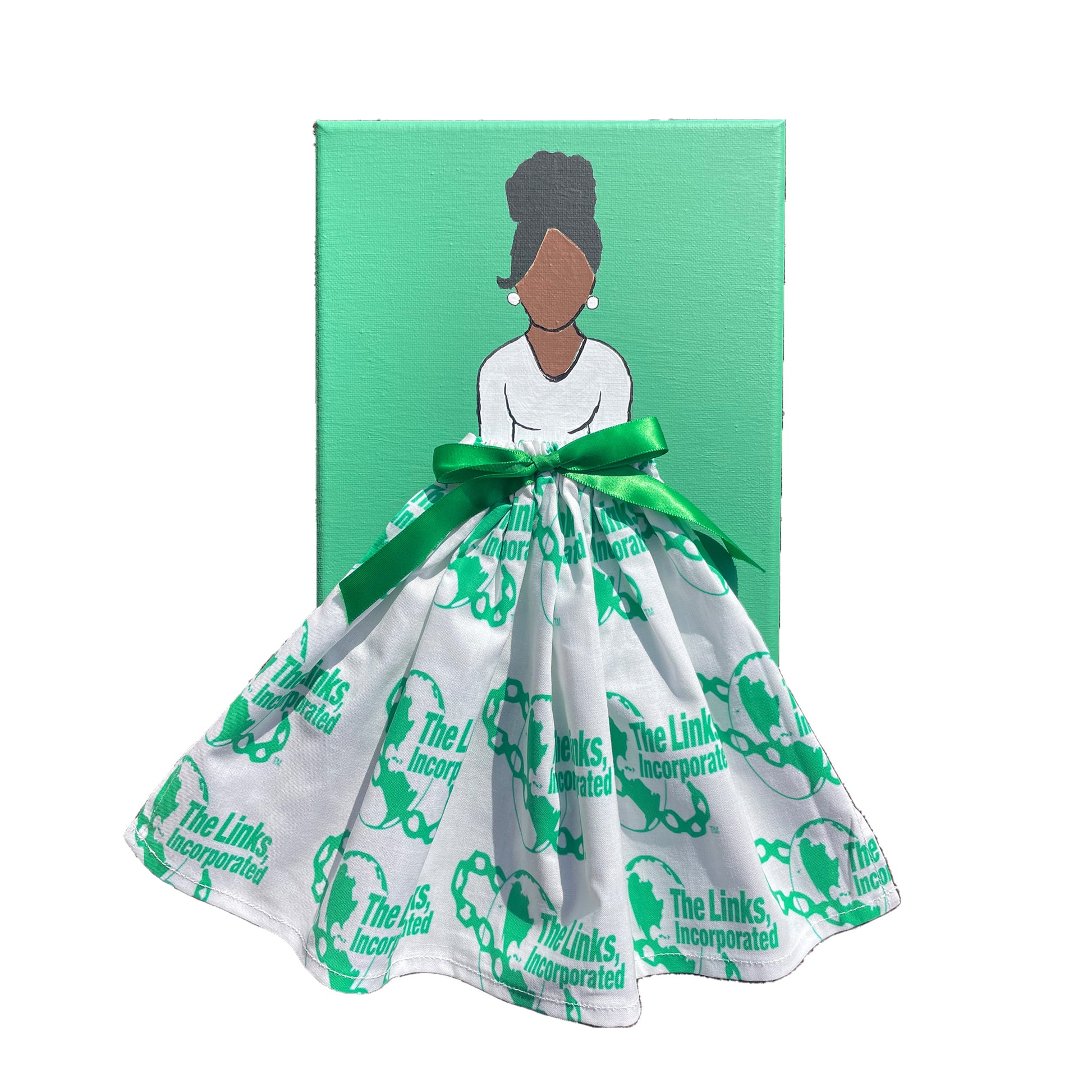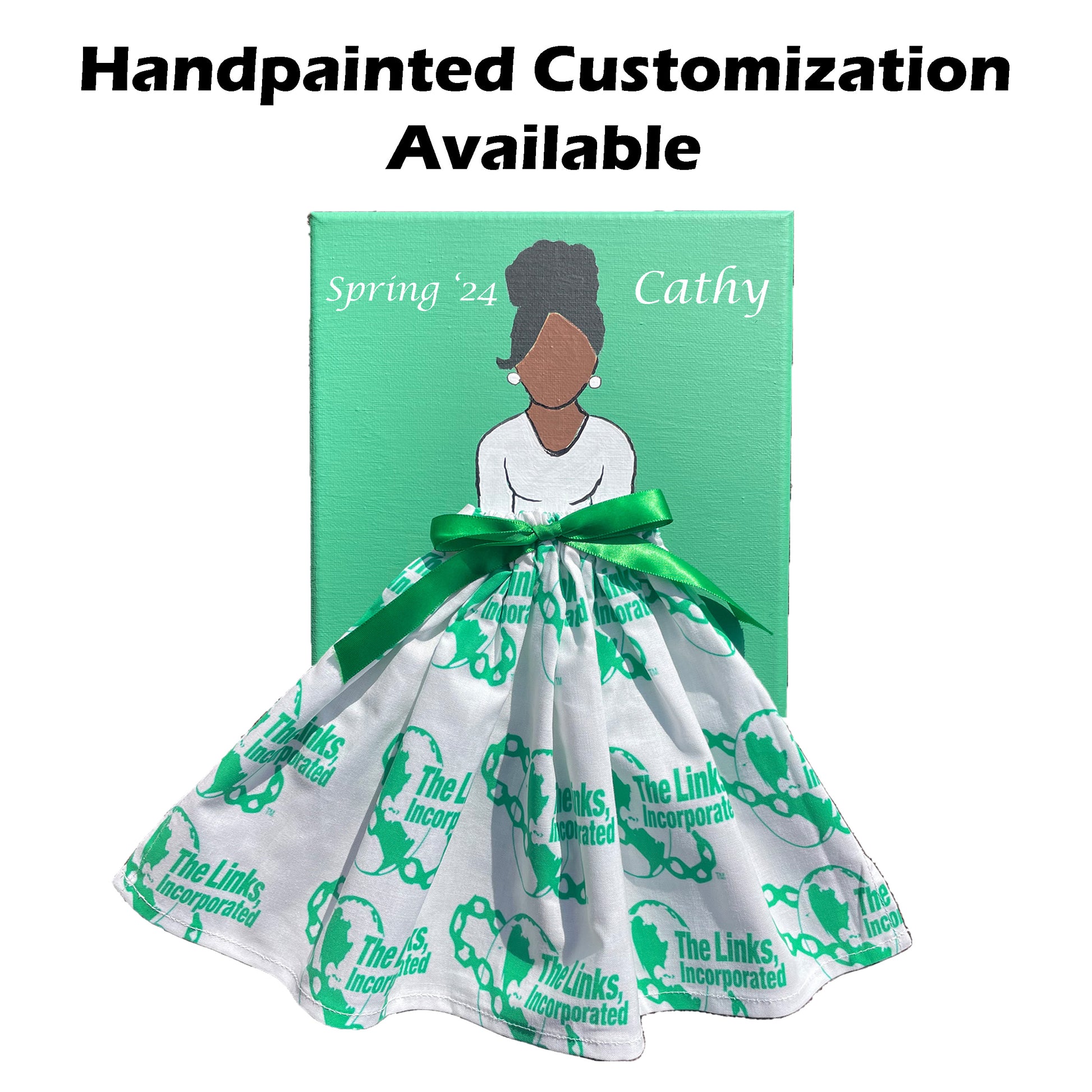 Made to order. The perfect decor gift to beautify a home wall or office space for a member of Links, Incorporated. Show your Links pride and affiliation with this stunning hand painted green and white artwork. Includes hand-sewn fabric skirt and optional personalization.